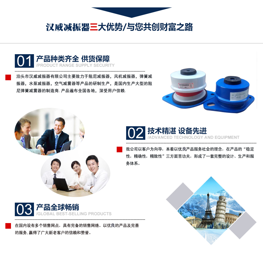 ?泊頭市漢威減振器有限公司主要致力于阻尼減振器,風機減振器,彈簧減振器,水泵減振器,空氣減震器等產品的研制生產,是國內生產阻尼彈簧減震器的制造商,產品廣泛用于中央空調、通風管道、鋼鐵、發(fā)電、石化、水泥和城市供熱等行業(yè)的各類管道和設備上,并在全國多地工程上得到應用,業(yè)績遍布全國多地,深受用戶信賴. 公司主要減振器系列產品有:中央空調系列減振器、泵房系列減振器、管道系列減振器、風機系列減振器、以及自行設計制作的系列隔振臺座。泊頭市漢威減震器科技有限公司擁有多名高素質技術人員,擁有完善的阻尼彈簧減震器生產和檢驗專用設備,擁有硅橡膠自動擠出生產線,全自動彈簧機等設備。生產條件逐漸完善進步,努力擴大生產規(guī)模,提高泊頭市減震器科技有限公司的生產競爭力。 多年來漢威減振器以三誠作為公司的字號,旨在立足當前......